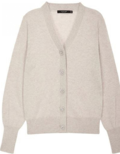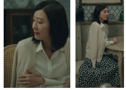 베이지색 가디건이 김희애의 피부톤과 잘 맞아서 더욱 화사하게 보이네요. 질스튜어트 뉴욕 제품으로 비즈장식이 포인트