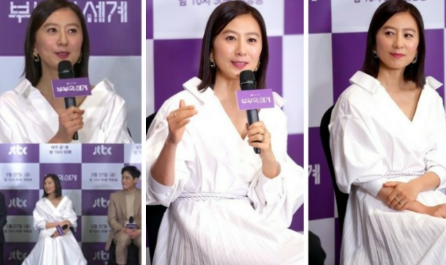 부부의세계제작발표회 에 입었던 김희애의 패션 인데요. 화이트 셔츠 원피스 입니다.