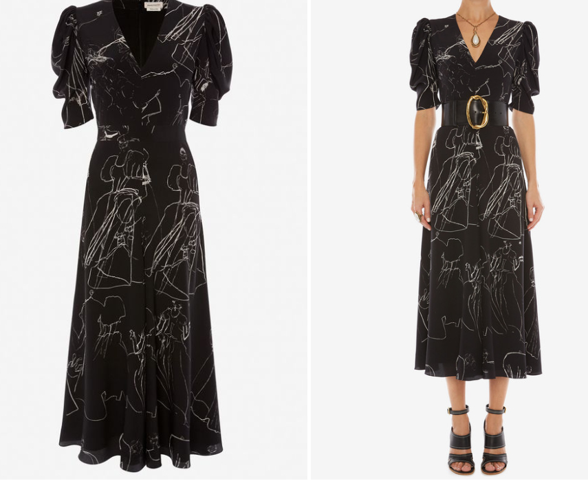 알렉산더 맥퀸의 S/S 컬렉션 입니다. 댄싱걸이 프린팅된 원피스 무늬 이구요. 브이넥이 깊게 파여 가녀린 목이 더 도드라져 보이는것 같습니다. 시크하면서도 도도한 매력을 보여 주는데요