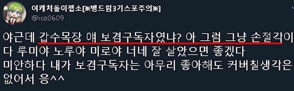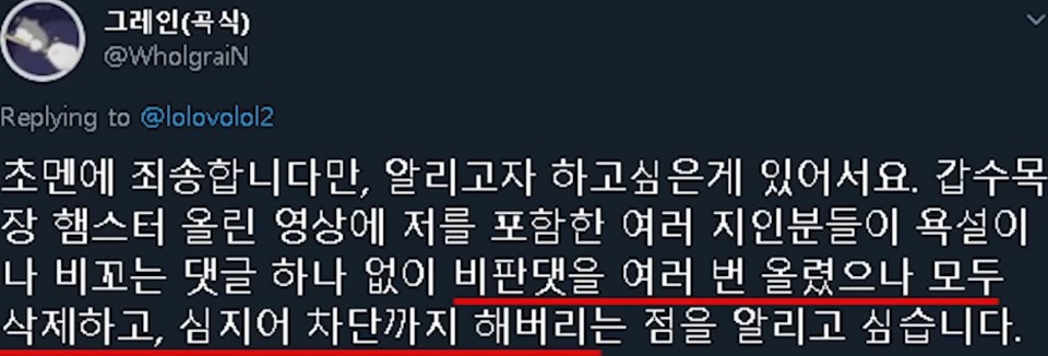 그래서 갑수목장님이 댓글을 몇개 지웠는데요. 이런것에 대한 논란을 사과없이 삭제하는건 잘못될수 있다 생각하는데... 그거에 대한 갑수목장님의 입장문 및 사과문을 발표합니다.