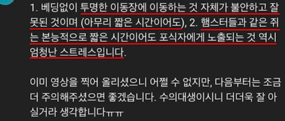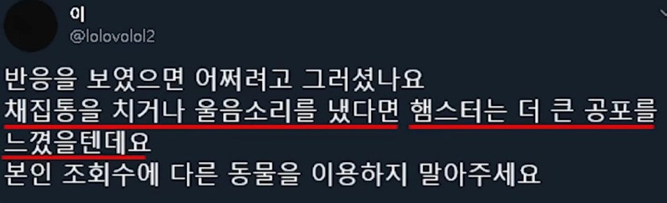'햄스터에 스트레스를 줬다' 이런 생각인것 같은데요. 보통 동물영상들이 다들 비슷한데 이런 영상컨셉은 검색해 보면 많