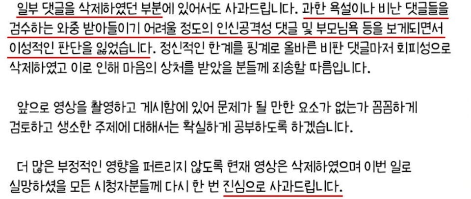 모든 비판댓글을 지운것이 아닌 인신공격 및 부모님욕을보게 되면서 이성적인 판단을 잃어서 그런것만 지웠다고 하는데요 그러면서 다시한번 사과의 마음을 글로 적으셨습니다., 뭐 보셔도 아시겠지만 이러한 논란은 트위터의 그녀들에게서 나온것입니다 ㅎㅎ 악플... 항상 그곳에서 많이 나는것 같네요..