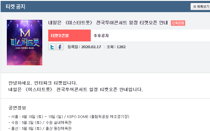 인터파크 티켓 티켓 공지에서 향후 티켓팅 일정 발표를 수시로 확인해보시면 되겠습니다.++