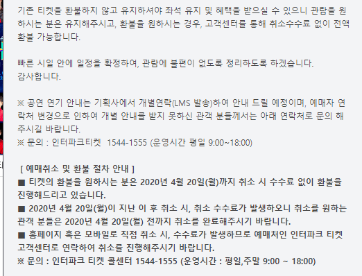 현재 코로나 19 관련한 문제로 티켓팅 및 공연일정이 잠정 중단 되었다가 다시 열렸습니다.
