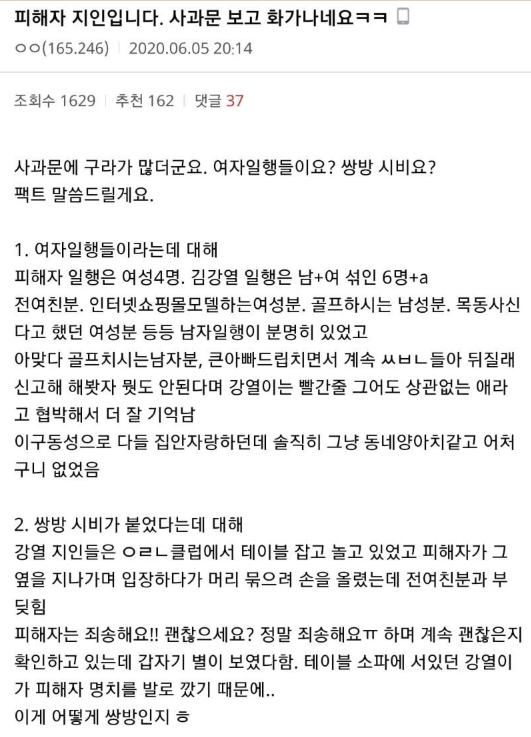 다음은 한커뮤니티에 올라온 김강열씨의 사과문을 보고난후 피해자 지인이 올린 글입니다.