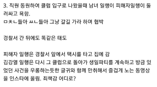 그러면서 "평범하게 회사에 다니고 친구들과 주점에 갔다가 피해를 당했는데 이상한 억측이 제기돼 황당하다"며 "지금도 김강열 일행에게 신상이 알려질까 봐 두렵고 그때처럼 누군가 위에서 내려다 보면 공포감에 휩싸인다"고 털어놨습니다.
