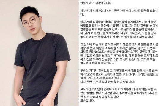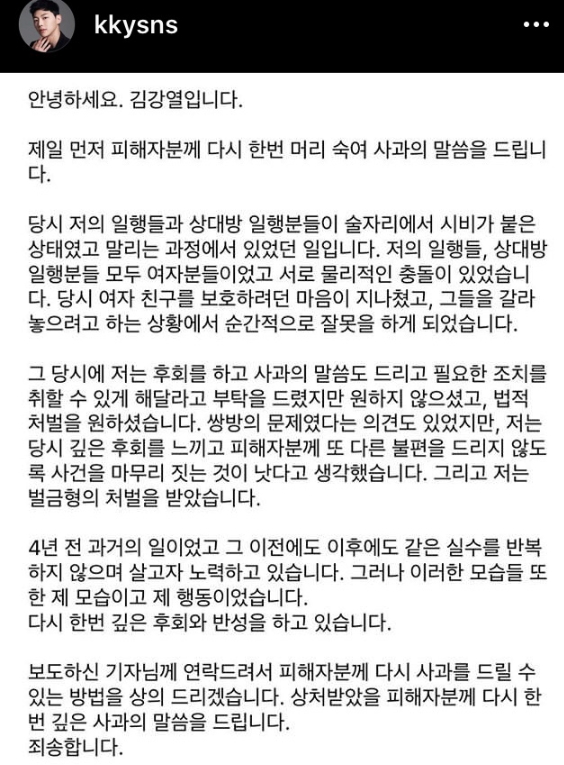 앞서 김강열은 4년 전 술자리에서 한 일행과 시비가 붙었고 여자친구를 보호하려던 마음이 지나쳐 수난적으로 잘못을 하게 됐다고 설명했습니다.