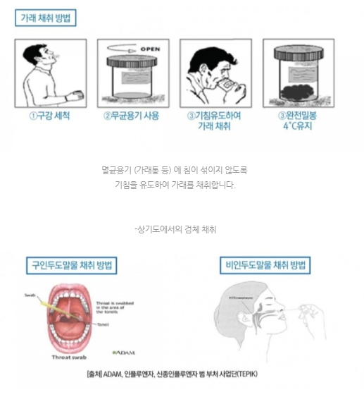 하기도(가래), 상기도(비인두 및 구인도 도말물)를 채취 하는데요. 가래 통에 기침을 뱉어 채취하거나 면봉으로 콧구멍, 목구멍 안쪽을 긁어서 채취 합니다. 검사에 걸리는 시간은 6시간이지만, 검체 이송 시간과 기타 사유를 고려하면 검사 후 1~2일 이내에 결과를 확인 할 수 있습니다.