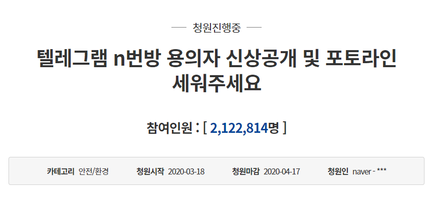지난 20일에 '텔레그램 n번방 가입자 전원의 신상 공개를 원합니다'라는 제목으로 올라온 청원에는 23일 오전 2시 기준 150만여명의 인원이 참여했다.