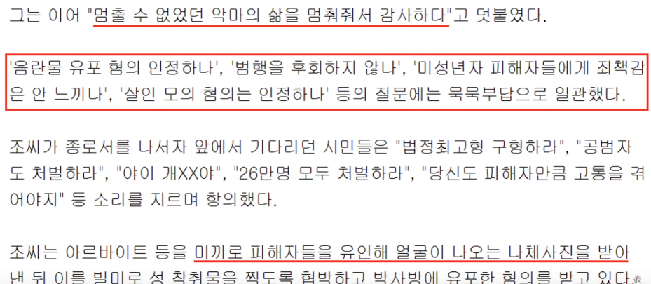 '음란물 유포 혐의 인정하나', '범행을 후회하지 않나', '미성년자 피해자들에게 죄책감은 안 느끼나', '살인 모의 혐의는 인정하나' 등의 질문에는 묵묵부답으로 일관했습니다.